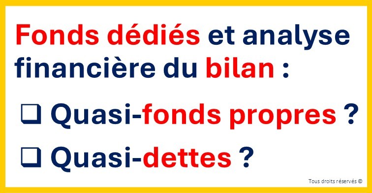 Lors de l’analyse financière du bilan, il est alors impératif de traiter les fonds dédiés comme des « quasi-dettes », à inclure dans le besoin en fonds de roulement (BFR), au titre des passifs circulants.✅